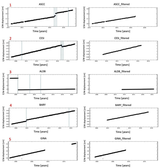 In Figure 4, five examples of the GNSS stations time series selection are shown. In particular, the plots on the left side show the original time series (we consider the East/West component as provided by the UNR-NGL web-site (http://geodesy.unr.edu)), while on the right, the corresponding ones following the automatic data screening procedure, are represented. Note that the plots 1 and 2 are representative of GNSS stations affected by seismic events: in particular, these two stations show the steps due to the 2016 Central Italy seismic sequence (24 August 2016, 30 October 2016, and 18 January 2017). Plots 3 and 4 outline some anthropic operations performed on the GNSS stations, which in some cases corrupts the GNSS station deformation rate estimation. Finally, we show that plot 5, although not supported by the auxiliary information, is filtered by the algorithm, which identifies the large temporal gap in the data and rejects the shorter part of the available time series, thus allowing a proper mean deformation rate estimation.