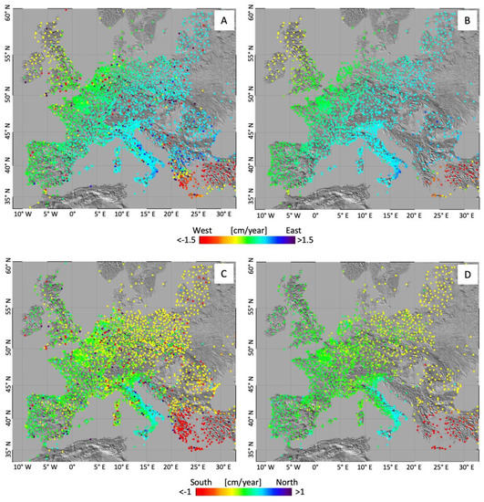 In Figure 5, we represent the planar components (East-West and North-South) of the GNSS stations of the NGL catalogue, located in the entire European territory under investigation in this work. It is evident from the visual inspection of Figure 5 that the stations selected for our processing are highly spatially correlated and with no evident singularities present.