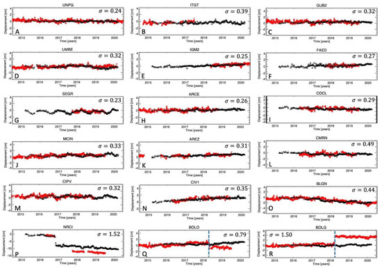(A–R) Comparison between the P-SBAS (black triangles) and the LOS-projected GNSS (red stars) deformation time series relevant to the stations labelled in Figure 7 with capital letters from A to R. The standard deviation values (in cm) of the difference between the two time series are also reported.
