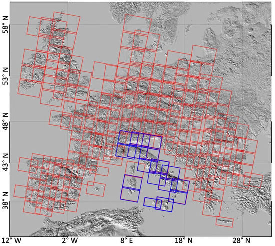 As stated already, the SAR images we analyze have been acquired by the Sentinel-1A and Sentinel-1B satellites. The overall investigated area has been divided in 175 frames, from 21 descending orbit tracks, with an average size of almost 200 × 250 km (azimuth and range, respectively). An overlap between frames has been preserved, covering almost 20% of the frame size for two subsequent ones in the azimuth direction. This overlapping area allows us to perform consistency tests on the analyzed zone, in order to guarantee an additional check for the continuity preservation of the achieved result. In Figure 9, we show the footprint of the 175 S-1 frames processed in this study.