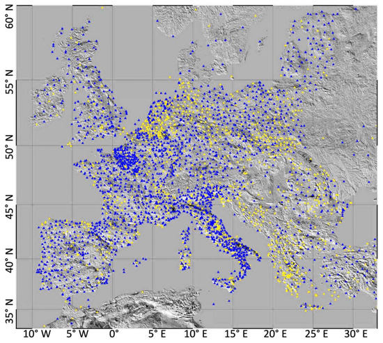Overall GNSS stations analysed in the presented study. Blue and yellow markers represent the exploited and the discarded stations, respectively, following the screening and selection procedure discussed in Section 3.