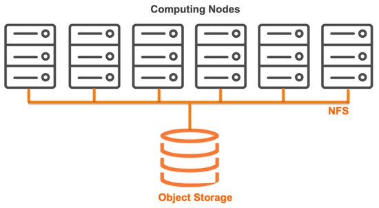 As anticipated before, we perform the CC implementation of the S-1 IWS P-SBAS processing pipeline discussed in Section 2, by exploiting the computing resources provided by the ONDA DIAS CC platform [26]. In particular, we use six computing nodes, each one equipped according to the characteristics reported in Table 1. Note that the six nodes are connected to the S-1 IWS data archive, which is located on an object storage, via NFS with a guaranteed download bandwidth of 2 Gb/sec (see Figure 11). As mentioned, having the data archive close to the computing resources and accessible through a dedicated and fast connection is a key requirement when the processing of such a huge data volume is envisaged, because of the data transfer overhead. In this framework we also remark that we fully benefit from the specific APIs made available by ONDA in order to effectively and automatically perform the S-1 images query and download operations.