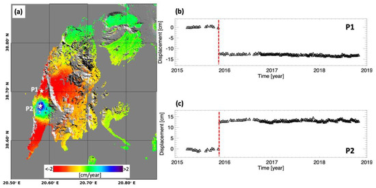 In Figure 14a, we highlight a sketch of the mean deformation velocity map relevant to the Lefkada Island (Greece). It outlines a spatially extended deformation pattern, characterized by both negative and positive LOS-projected displacement signals, which are related to the Mw 6.5 earthquake that struck the island the 17 November 2015 [48,49]. Moreover, we present the corresponding displacement time series relevant to two selected pixels (labeled as P1 and P2 in Figure 14a and marked by white stars) located in the maximum co-seismic deformation zone. They clearly show the deformation signal associated with the seismic event, see the discontinuity characterizing the time series of Figure 14b,c in correspondence to the earthquake (highlighted by a vertical dashed red line).