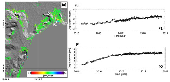 In Figure 15, we show a zoomed-in view of the mean deformation velocity map relevant to the Northern Black Sea coast, between the Varna and Kavarna towns (Bulgaria). This area is characterized by numerous landslides, mainly due to soil over-moistening, marine erosion, slope cutting and seismic impacts, which have caused serious damage to buildings and infrastructure over time [50]. Figure 15a reports the LOS mean deformation velocity map of the area while Figure 15b,c display the corresponding displacement time series relevant to two selected pixels (labeled as P1 and P2 in Figure 15a and marked by white stars), located in Balchik town and in Kranevo village (both between Varna city and Kavarna town), respectively. These plots clearly show the ground movements, characterized by different rates (about 1 and 1.8 cm/year for P1 and P2, respectively), related to the landslides.