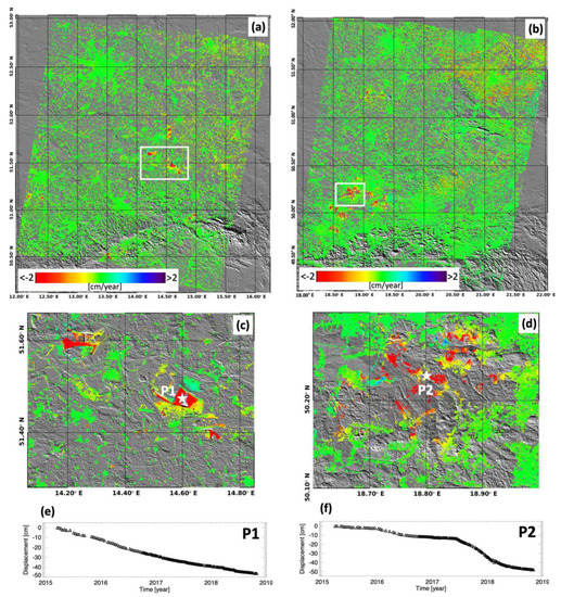 Moving from the ground deformation analysis related to natural phenomena to human-induced activities, we benefit first from the DInSAR capability to investigate displacements caused by mining activities [51,52]. In particular, we show in Figure 16a,b two zooms of the map of Figure 12 relevant to rather wide zones located in Germany (a) and Poland (b), respectively, where significant mining activities are carried out. In Figure 16c, we report a zoomed-in view in correspondence to the Nochten coalmine and surroundings, located in the Saxony-Anhalt State (Germany), where the effects of the sub-surface exploitation activities on the ground deformation are evident. In addition, we show in Figure 16e the displacement time series relevant to a selected pixel (labeled as P1 in Figure 16c and marked by a white star) that reveals cumulative displacements of more than 45 cm in the considered time period. Similarly, in Figure 16d we show a zoomed-in view of the Katowice coalmines, located in the Silesian Region (Southern Poland). As for the German case, the ground deformation related to mining actions are clear. The plot of the displacement time series (see Figure 16f) relevant to a selected pixel (labeled as P2 in Figure 16d and marked by a white star) located in the area shows a clear non-linear deformation behavior, which is effectively retrieved through our P-SBAS-based analysis.