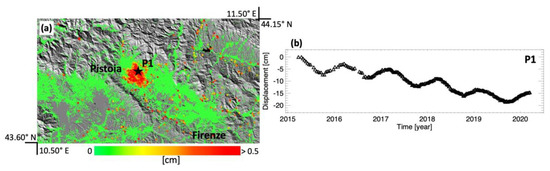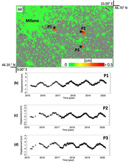 We remark that, following the deformation time series retrieval operation, the S-1 IWS P-SBAS processing chain automatically supplies various value-added information on the ongoing deformation phenomena. Indeed, in addition to the estimate of the mean deformation velocity, it also automatically identifies possible deformation signals characterized by a periodic behavior with respect to time, such as those relevant to oil and gas extraction/storage activities and water withdrawal, which represent significant DInSAR applications in the energy source storage [53] and hydrogeological [54] fields. This is done by computing the correlation coefficient of each pixel’s detrended time series with a sinusoid with a one-year period. In Figure 17a we show the peak-to-peak amplitude of the sinusoid signal in an area located in Northern Italy, close to the city of Milano. Note that pixels with peak-to-peak amplitude values equal to 0 are those for which the correlation coefficient is smaller than 0.8. The oscillation amplitude map clearly identifies three distinct areas that correspond to three gas storage sites located in the zone. In Figure 17b,c we show the displacement time series relevant to three selected pixels, labeled as P1, P2, and P3 in Figure 17a and marked by black stars, located in correspondence to the Settala, Sergnano, and Ripalta Guerina sites, respectively. The displayed time series reveal periodic deformation signals that correspond to the human-induced actions carried out to ensure gas supply during the winter. Indeed, the plots clearly show the effect of the injection of gas into storage during periods of low demand (approximately from March to October), which produces a raising of the soil over the reservoir area. Conversely, it is evident that a subsidence effect during periods of peak demand (approximately from November to February) occurs due to the withdrawal of gas migration from storage into the town’s gas supply system. As a further example of this kind of analysis, we show in Figure 18 the oscillation amplitude map relevant to the Firenze-Prato-Pistoia basin (North Italy). In this case, the displacement time series relevant to a selected pixel (labeled as P1 in Figure 18a and marked by a black star) shows a clear subsidence signal, caused by the large amount of ground-water extracted due to the industrial activities carried out in this area [35,36]. Moreover, this subsidence trend is modulated by a seasonal oscillation, due to the groundwater withdrawal and recharge during the summer and winter seasons respectively, see Figure 18b.