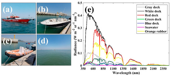(a) Fishing boat, (b) yacht, (c) lift boat, (d) seawater, and (e) spectral radiance of the decks of vessels and seawater as a function of wavelength.