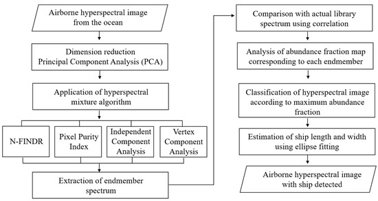 The entire procedure from hyperspectral airborne observation to the vessel detection and size estimation from an ellipse fitting method is presented in Figure 4. First, hyperspectral airborne observations surrounding the study area are performed. The principal component analysis (PCA) is applied as a pre-processing step for dimensional reduction of vessel hyperspectral images. Spectral mixture techniques including N-FINDR, pixel purity index (PPI), independent component analysis (ICA), and VCA are applied to extract the spectrum of end members of vessels and seawater for the hyperspectral images. The type of endmember can be inferred by comparing the similarity between the endmember and the marine spectrum library accumulated from in-situ measurements. Image classification based on a unit pixel can be classified through the maximum abundance fraction. Finally, the length and width of the vessels are obtained by applying ellipse fitting to the pixels classified as vessels.