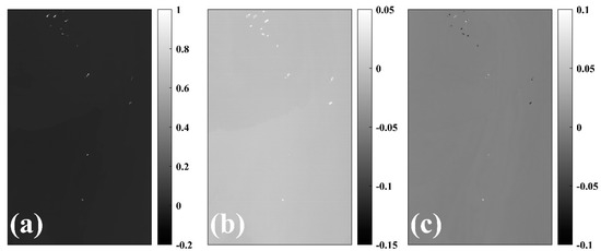 Spatial distributions of (a) the first mode, (b) the second mode, and (c) the third mode of the airborne hyperspectral data from principal component analysis (PCA).