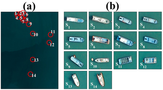 As a result of performing the composite procedure of the airborne hyperspectral data, the RGB image presents 14 vessels (Figure 6a). They are mostly concentrated in the upper portion near the port. To validate the results of the hyperspectral image analysis, a DMC image with a high resolution of 0.10 m was used. The DMC image presents the exact position of the vessels and a total of 10 fiber-reinforced plastic (FRP) vessels with blue decks (S1, S3−S9, S11, and S12) (Figure 6b). It reveals the shapes and detailed structures of every vessel. For example, the S2 vessel is a fishing boat with a white steering wheel on a gray deck. S10 is also a fishing boat with mostly gray decks and some white steering with red and green structures on the roof. S13 is a yacht with a single white deck, and S14 is a lifeboat with a white deck and an orange border. S10, S13, and S14 are pre-arranged for validation, as shown in Figure 3a–c, respectively.