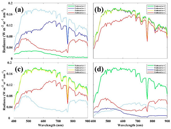 Comparison of endmember spectra radiance using different spectral mixture algorithms (a) N-FINDR, (b) pixel purity index (PPI), (c) independent component analysis (ICA), and (d) vertex component analysis (VCA).