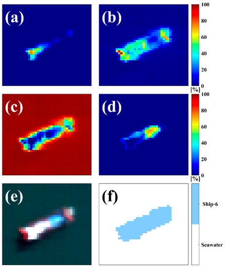 Abundance fraction map (a–d) corresponding to endmembers 1–4, and (e) RGB composite image. (f) Spatial distribution of the classification result for the S6 vessel based on the abundance fraction of the seawater endmember.