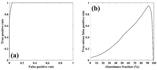 Endmember-3, with a fraction of 100% in most pixels except for the vessel in the center, corresponded to seawater (Figure 8c). This occupied more than 70% of the pixels along the vessel boundary. Pixels greater than 60% were concentrated on the front portion of the vessel, which were considered to be the pixels of the blue deck (Figure 8d). It had a high correlation of approximately 0.60 with the measured FRP blue spectrum. This result implies that the vessel and seawater can be classified based on the occupancy rate of seawater, herein endmember-3. The criterion was adopted through receiver operating characteristics (ROC) curve analysis according to the abundance fraction change, which results in a high detection probability when the true positive rate is high, and the false positive rate is low (Figure 9a) [54]. The abundance fraction that maximizes the difference between the true positive rate and the false positive rate is approximately 92% as shown in Figure 9b. The threshold was given as 90% by considering the uncertainty of the detection probability. Thus, it is concluded that the pixels occupying more than 90% of the abundance fraction of seawater were treated as seawater pixels and the rest were judged to be vessels (Figure 8f).
