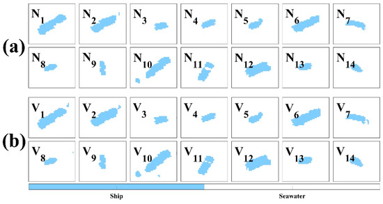 Figure 10a demonstrates the result of detecting a vessel by the N-FINDR technique based on the endmember-1 abundance fraction corresponding to seawater. Pixels with a ratio of endmember-1 more than 90% were detected as seawater, and pixels with a lower ratio were classified as vessels.