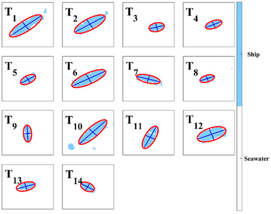 To estimate the length and width of the vessel detected by the hyperspectral detection algorithm, we applied the ellipse fitting method [53]. This technique was designed so that the shape of the vessel boundary was most similar to an ellipse. The boundary pixels corresponding to the edge of the vessel were extracted from the magnitude of 2-D spatial gradient differences between the pixels detected by the vessel, and the surrounding background pixels of seawater. By applying the least-squared fitting of an ellipse equation to the geolocations of the boundary pixels, the characteristics of the ellipse, such as major- and minor-axis lengths, and a tilting angle, were then extracted. Here, the length and width of the vessel indicate the major- and minor axes of the ellipse.