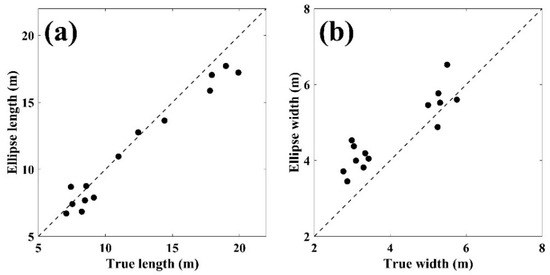 Comparison of (a) length and (b) width of vessels estimated by ellipse fitting.