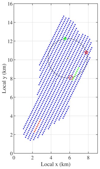 The PRMRA geometry. Not all the receivers are plotted in the figure for display purposes. The gather marked in red is used in the following example of beamforming. The gathers marked in green and red are used in the following examples of the NCC retrieval. The black circle and marks on it are used in the following study of events.