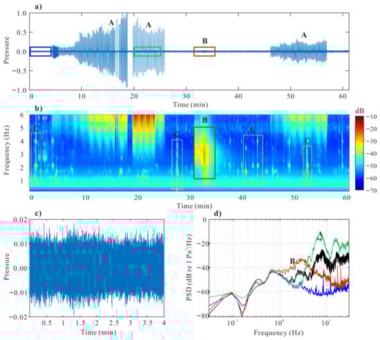 Temporal and spectral analysis. Letters A, B and C denote different events detected. (a) the pressure recorded at one receiver. The pressure is normalized by the maximum amplitude. The blue box selects a window where the noise is not affected by severe events. The green box selects a window where the noise is affected by Event A. The red box selects a window where the noise is affected by Event B; (b) the averaged PSD (dB re 1 Pa2/Hz) of all receivers as a function of time and frequency (spectrogram); (c) the enlarged view of the noise marked by blue box in (a); (d) the PSD of the corresponding noise marked by boxes in (a). The curves are related to the noise by the color of the boxes in (a). The black curve is the averaged PSD over 60 min.