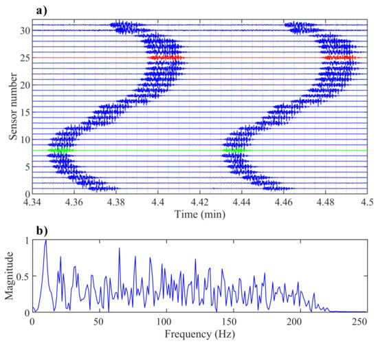 Figure 2 shows that Event A has a very regular time interval. The temporal and spectral signatures of Event A indicate that it comes from artificial sources which are very like airgun shots from other seismic surveys near this field. Unfortunately, there is no exact information available on these shots. In order to further study these signals, a travel time study is employed. Thirty-one sensors on the circle in Figure 1 are selected and numbered counterclockwise (with the red five-pointed star numbered as 1). Figure 3a shows the arrival time of the airgun signal on different sensors. The 4th sensor gets roughly the earliest arrival (green) and the 25th sensor gets the latest arrival (red). The 4th sensor and the 25th sensor are marked by a green asterisk and the red small circle in Figure 1, respectively. It indicates that the angle of incidence of the airgun shots is approximately 45° (the normal direction, which is perpendicular to the cable, is taken as a reference in the paper). The velocity of the signal is about 1450 m/s, which is estimated by travel time analysis. Figure 3b shows the spectrum of the signals in Figure 3a. It shows that the main energy of the airgun is concentrated in the frequency band of 3 to 200 Hz.