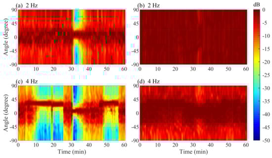 Figure 4 shows the beamforming result of one gather which is marked in red in Figure 1. Figure 4a,c show the beamforming energy distribution of the original wavefield. The energy is higher in the directions of −20° to 20° in Figure 4a than the background level. The energy becomes extraordinarily high from 30 to 40 min at 0° and can be recognized as Event B considering the high consistency in time and frequency. It indicates that Event B comes from the normal direction of the array. In Figure 4c, a source dominates the beam power with an almost constant direction of about 40°. It can be recognized as Event A considering the high consistency in time. The travel time study of Event A shows the incident angle of the airgun shots is approximately 45°. The misfit is caused by the usage of averaged phase speed in the beamforming. Figure 4a,c indicate that the original wavefield is affected by several strong, directional sources at both 2 Hz and 4 Hz. Event C, however, is not visible in the beamforming results because they have relatively lower energy than other events.