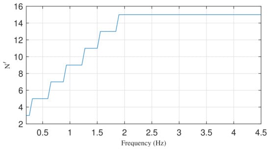 Equation (A2) implies that the determination of only relies on the frequency, the slowness of the medium, the typical separation, and the number of sensors used. Since the slowness of the medium is not known beforehand, a rough estimation of the average slowness is sufficient to use in practice, as is suggested by Seydoux et al. [30] (1.1 s/km is used in this paper). Thus, if we choose gathers with the same shapes, the value of is a function of frequency.