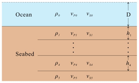 A 6-layer geoacoustic model (shown in Figure 8) is used in the inversion. The 6th layer is a semi-infinite space. Considering that the dispersion property of the surface wave is not sensitive to the density and the compressional velocity in the frequency range used (0.2 to 4.5 Hz), we use the following empirical equation [34,35]