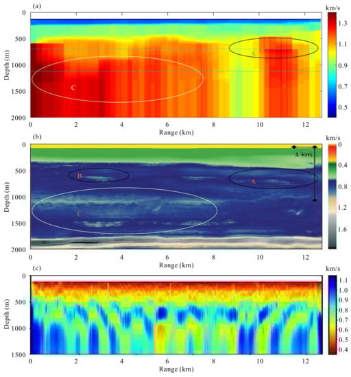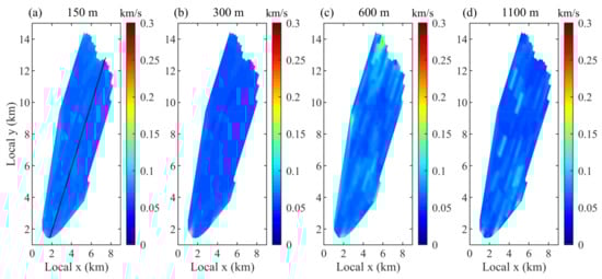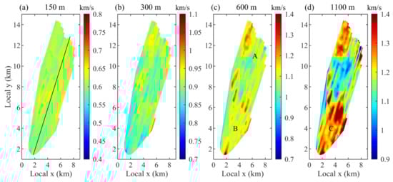 Figure 9b displays a similar slice of the shear-wave subsurface structure from active-source reflection tomography at the same field from [36]. The active-source has higher energy and the resolution of the reflection tomography is better. Thus, we consider it as a good approximation to the true model of the seabed. The top thin layer (125–140 m) of Figure 9a can not be recognized in Figure 9b. It might be caused by the regularization method which smooths the layers. However, it can be recognized easily in the P-wave velocity structure in [36]. The existence of the top thin layer in Figure 9a is reasonable because the top layer of shallow ocean is usually very soft with low shear-wave velocity. Figure 9b combines the first and second layer ( 125–240) of Figure 9a and shows a velocity of around 500 m/s at this layer. When the depth goes deeper in Figure 9b (240–500 m, corresponding to the third layer of Figure 9a), the velocity increases from 500 to 900 m/s. The third layer of Figure 9a can be considered as a transition layer at this place, compared with Figure 9b. In the depth range of 500 to 1700 m, although Figure 9a generally shows higher velocities than Figure 9b, they do have some similarities in the structure. At the depth of 600 m, Figure 9b shows two high-velocity zones A and B. We can find a similar zone A in Figure 9a, while zone B is not visible here possibly because of limited resolution of inversion using ambient noise. If we look further at the horizontal slice of the subsurface structure at the depth of 600 m in Figure 10c, both the high-velocity zones A and B can be recognized. At the depth of 1000 to 1600 m, Figure 9b shows another large high-velocity zone C. We can find a similar zone C in Figure 9a, although it is not as large as the zone in Figure 9b. The horizontal slice of Figure 9a at the depth of 1100 m demonstrates the distribution of this zone in Figure 10d, which is larger than it shows in Figure 9a. The high similarity in these zones of Figure 9a,b indicates that these high velocity anomalies are reliable and can be recognized as real features of the seabed. Below the depth of 1700 m, Figure 9b indicates a layer with very high velocities, which can not be recognized in Figure 9a. One possible reason is that surface wave can not penetrate to this depth, so that the inversion of Figure 9a is not sensitive to the shear-wave velocity at this depth.