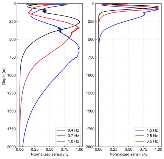 Figure 11 shows the normalized depth sensitivity kernels for different frequencies of surface waves. It shows that lower-frequency kernels have peak sensitivity at deeper depths while higher-frequency kernels have less sensitivity to deep subsurface structure. It also indicates that deeper layers may be mostly determined by frequencies lower than 1 Hz.