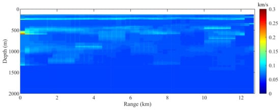 Figure 9a displays a vertical slice of the shear-wave subsurface structure under the 10th cable counted from left to right of the PRMRA in Figure 1. Four subsurface layers (excluding the water layer) are well resolved from a holistic perspective, although a 6-layer model is used in the inversion. The top white layer (0–125 m) denotes the water layer. The first layer (125–140 m) is a low-velocity layer (lower than 300 m/s) which is very thin. This layer locates near the ocean bottom and is thought to be very soft. The second layer (140–240 m) is relatively thicker and harder, and contains a velocity of about 500 to 600 m/s. As the depth goes deeper, the layers become much thicker and contain larger velocities. The third layer (240–500 m) contains a velocity of about 800 to 900 m/s. The interfaces for the top three layers below the water layer are clear and the velocity values distribute relatively homogeneous over range. The bottom layer (>500 m) is a high-velocity layer. The velocity values of it mostly span from 900 to 1300 m/s (can be even larger in several areas), indicating a more complicated structure compared with the top three layers. Note that the resolution in range of Figure 9 is 200 m, which is dependent on the chosen overlap between the adjacent gathers.