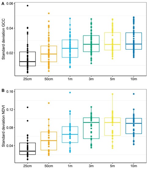 Standard deviations for aggregated means to assess variability in GCC (A) and NDVI (B) within plots of increasing spatial resolution. For both GCC and NDVI, the standard deviation is smaller for finer spatial resolutions, and increases with increasing spatial resolution till 3-m radius at which point the standard deviations plateau. The plateau indicates that the 3-m, 5-m, and 10-m have comparable variability. The patterns illustrate that GCC and NDVI exhibit similar patterns of heterogeneity.