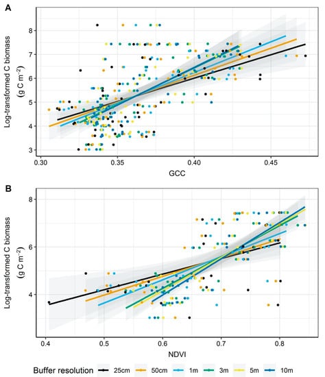 To assess how GCC and NDVI relate to each other at increasing spatial resolutions (from 25 cm to 10 m), we performed a correlation analysis. For each spatial resolution, the vegetation index values were an aggregated mean of pixels extracted at an increasing radius of 25 cm, 50 cm, 1 m, 3 m, 5 m, and 10 m from the plot center. The buffer radius was measured from the GPS coordinates taken from the center of each field plot along the transect. We opted for this approach since the pixel resolutions were not consistent across all imagery (Table 2). Further, aggregating pixels over a spatial area into a mean pixel value improves linkages to coarser resolution satellite imagery [], and spatial aggregations have been evaluated in several investigations e.g., [,,,]. The spatial scales were chosen to correspond to ecologically meaningful scales where finer resolutions are associated with an individual plant’s area, and coarser resolutions are associated with field plot sizes.