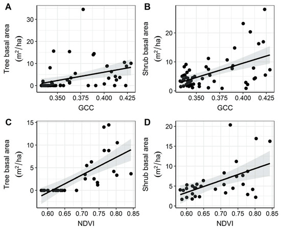Linear models testing for a relationship between vegetation indices and basal area (BA). Graphs show fitted relationship with 95% confidence intervals and raw point data. Shrub basal area was not predicted well by GCC (B; R2 = 0.29) or NDVI (D; R2 = 0.28). Tree basal area was predicted poorly by GCC (A; R2 = 0.14) and was predicted best by NDVI (C; R2 = 0.52).