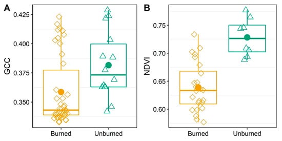 A comparison between burned and unburned pixels for mean GCC (A) and NDVI (B) with a 10-m buffer radius. Boxplots indicate quartile distribution with raw data for burned (diamonds) and unburned (triangles) plots. The estimated mean is the point. A Welch t-test for unequal variance was performed to test for a difference in the means of GCC (A) and NDVI (B) between burned and unburned areas.