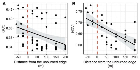 Lastly, we evaluated the difference in GCC and NDVI values between burned and unburned areas as well as how vegetation indices change across the field transect from the unburned into the burned area. We used the 10-m aggregated mean for GCC and NDVI based on the correlation analysis and evaluation of standard deviation spread. A Welch t-test [] for unequal variance was performed to test for a difference in the means of GCC and NDVI between burned and unburned areas. We then regressed GCC and NDVI separately against distance from the unburned edge.