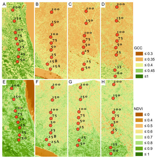 GCC (A–D) and NDVI (E–H) imagery calculated from UAV imagery that corresponds to field transects. Alnus transect 1 burned in 1984 (A,E). BP transect 2 burned in 1983 (B,F). CN transect 1 burned in 2001 (C,G). CN transect 2 burned in 2001 (D,H). Plot locations are labeled with negative values indicating field plots on the unburned portion of the transects and positive values indicating distance into the burn in meters. Edges of fires were identified prior to the field campaign with satellite imagery.