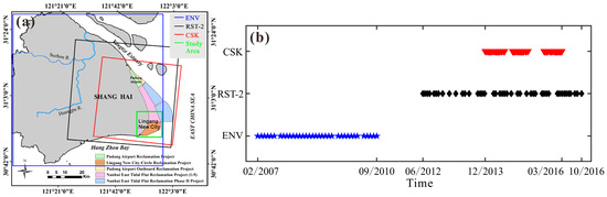 (a) Location of the Lingang New City of Shanghai, the coverages of the ENVISAT ASAR (ENV), Radarsat-2 (RST-2), and COSMO-SkyMed (CSK) synthetic aperture radar (SAR) datasets are depicted by the green, blue, black, and red rectangles, respectively. (b) Temporal distribution of the ENV, RST-2, and CSK datasets.