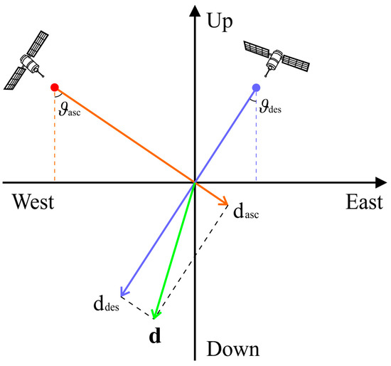 where , and are the 3-D cumulative deformation components in the East–West, North–South, and vertical directions, respectively. Moreover, is the radar-to-target incidence angle and is the corresponding satellite-heading angle. The geometry of the multiple-angle SAR acquisitions (ascending/descending) is shown in Figure 3.