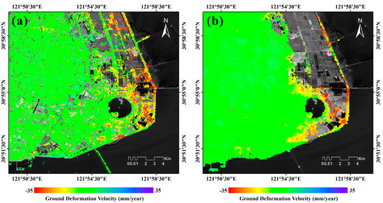 Lingang New City ground deformation. (a) Map of mean velocity calculated with the CSK vertical ground deformation time-series, from December 2013 to March 2016. (b) Map of mean velocity calculated with the RST-2 vertical ground deformation time-series, from January 2012 to October 2016.