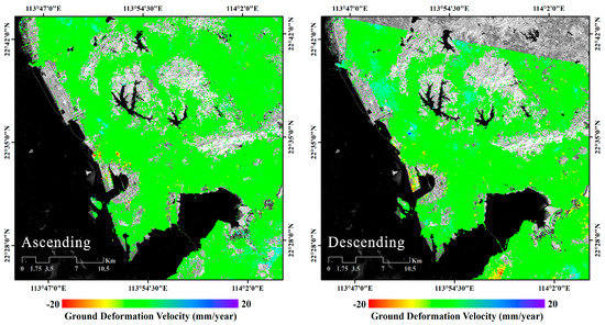 Shenzhen area results. Maps of ascending (left) and descending (right) mean deformation velocities retrieved by the ascending and descending ENV datasets. Only well-processed coherent SAR pixels exhibiting a temporal coherence larger than 0.6 were considered.