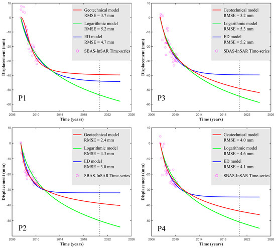 For comparison, we estimated the ground-deformation time-series from June 2007 to April 2010 at the four points labeled P1, P2, P3, and P4 shown in Figure 13. Then, we obtained the three related best-fit models, which are shown in Figure 15. Then, the quality of the three reconstructed nonlinear curve fittings was evaluated by computing the RMSE of the difference between the InSAR-based (vertical) ground deformation time-series and the obtained best-fit model. We note that the RMSE values between the SBAS-InSAR deformation time-series and the best-fit geotechnical model are smaller than those of the other two models at the four selected points. These results indicate that the geotechnical model outperforms the other two models, also considering the test site in the area of the Shenzhen city.