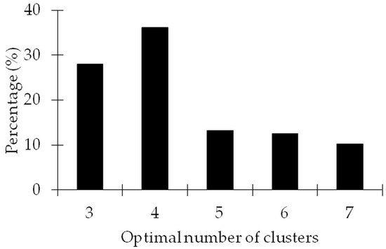 In (6) represents the number of clusters, p is the number of pixels in the image, BGSS is the between-group (i.e., inter-cluster) sum of squares and WGSS is the within-group (i.e., intra-cluster) sum of squares. BGSS is made up from the summation of all the possible combinations of the squared distances calculated between two points in different clusters. The computation of WGSS involves the summation of all the possible squared distances in each individual cluster and then adding them up for all the clusters. Since is an unknown parameter the VRC was calculated using nine different values from to and the one that lead to the maximization of the VRC value was adopted. Maximization requires BGSS (WGSS) to be as greater (smaller) as possible in order to get a better separation of the groups. Since the optimal value of is image-specific it was found to fluctuate in the 3–7 range for the 2036 input images. Figure 2 shows the way distributes across the image dataset. There is a peak at (36% of the cases) followed by (28% of the cases). In order to use a single value of the nearest integer from the average over the entire set of input images was established; this value turned out to be . A validation method using bootstrapping was carried out by randomly choosing pixels from the different input images in order to determine a single value of for the resulting subsample image. This process was replicated several times and the outcome was also on average.