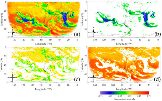 The MJO quantifies the intraseasonal variability in the tropical atmosphere and is known for influencing both the tropical and the extratropical weather patterns. More specifically, the MJO plays a role in modulating the precipitation regime through the interaction between the general circulation with deep convection ([80] and references therein). In particular, the active phase of the MJO had an effect in the activation of large convective cloud systems with temperatures at their top in agreement with the ones in the lower portion of the histograms in Figure 11 ([80] and references therein). The correlations between the MJO and cluster 1’s number of pixels occurred during (austral) summer and fall—when the MJO is at its peak [80]— and all through the year (cf. Table 4). Even though no significant ρ values were found for the rest of the seasons, it is likely that the significant year-round values are strongly influenced by the contributions from summer and fall since it is in these two quarters when convection is stronger in the SH due to the astronomical forcing. The zonal differences in both the strength and the sign of the correlations were related to the MJO’s alternation between its active and suppressed phases across the latitudes it was calculated at, making the strongest positive (negative) ρ values to take place at 140 °E (20 °E). As with cluster 1, the phasing of the MJO can be recalled to explain the year-round correlations with cluster 2’s number of pixels across the different longitudes as well, yet the MJO’s role in modulating the number of pixels in this cluster was not as strong as with cluster 1’s (i.e., the ρ values were lower). On the other hand, there was a seemingly stronger modulation in cluster 2’s number of pixels in winter (spring) when convection was suppressed (active) at 80 °E (120 °W). In view of the general agreement of cluster 2 with the cloudiness present in synoptic-scale processes (cf. Figure 12) and their pixels spreading across the entire study region (cf. Figure 8), these results show an apparent connection between the mesoscale and the synoptic scale. Such a relationship between these two different atmospheric scales has been documented for the region (e.g., [94]). The MJO at 70 °E was the only index that correlated with clusters 3 and 4, in spring and winter, respectively. This could be related to the aforementioned swapping in the number of pixels between these two clusters. On the other hand, the entropy in summer and fall seemed to generally decrease when convection was enhanced over Africa (MJO at 20 °E) and the Atlantic and the Indian Oceans (MJO at 10 °W and 70 °E, respectively), and to increase when convective activity at the Tropical Warm Pool (TWP; MJO at 100°E, 120°E, 140°E and 160°E) was at its top. Something similar occurred in springtime and year-round but more restricted longitudinally respecting the MJO.