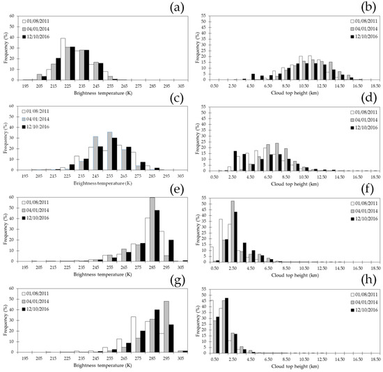 Figure 8j–l shows the configuration of cluster 4 on the selected dates. The number of pixels represented in them accounted for 20%, 42% and 29%, respectively, of the total number of pixels in the input images (not shown). Aside from Figure 8k, these percentages marked a difference in that they included fewer pixels than cluster 3. As with cluster 2 and 3, all latitudes were spanned by cluster 4’s pixels on the selected dates. Reddish pixels were by far the most abundant in all three cases. The mean value for Figure 8j–l was 278 K, 285 K and 284 K, respectively, while the SD values were 12 K, 9 K and 11 K, respectively. As to CTH, the mean values were 1.22 km, 1.61 km and 1.44 km, respectively; the SD values equaled 0.92 km, 1 km and 0.84 km, respectively (Table 2). The histograms of for clusters 3 and 4 bore a resemblance both in the shape and in the support. By contrast, the CTH cluster 4’s distributions shifted towards the lowest values, with the class intervals that had a noticeable contribution extending through 5 km (Figure 10h).