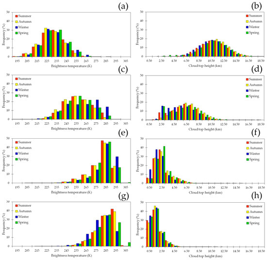 The first part of this subsection is dedicated to the analysis of the mean values, SDs and frequency distributions from a seasonal perspective. Table 3 shows the seasonal grand-time mean values and SDs for both and CTH. The term grand-time mean was used here to reflect that the calculations were carried out within the entire period of analysis irrespective of the year, incorporating information from December, January and February (summer), March, April and May (autumn), June, July and August (winter), and September, October and November (spring). A general result from Table 3 is that the seasonal grand-time mean values for (CTH) increased (decreased) as the cluster order increased, and that the intra-seasonal variability decreased as the cluster order increased for both and CTH. With the exception of cluster 4, in terms of CTH winter presents the seasonal lowest mean values and autumn had the highest ones; this made the autumn-to-winter transition generally steeper than in any other season-to-season case. As to variability, it was greater in spring for clusters 1 and 2, in autumn for cluster 3 and in summer for cluster 4. The grand-time histograms for the four seasons are presented in Figure 11. They did not differ in a remarkable fashion from the corresponding ones shown in Figure 10.