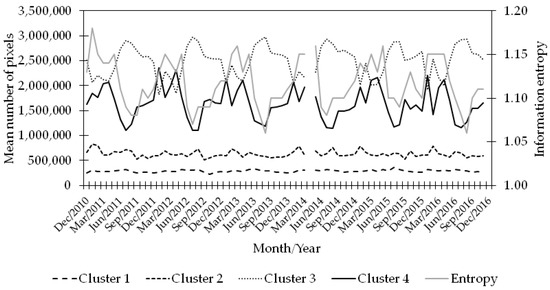 Monthly mean values for the number of pixels that populate each cluster and for the entropy.