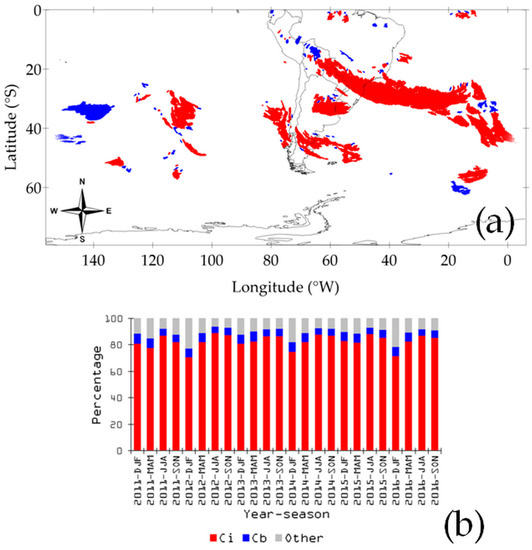 The poleward edge of extensive shields of cirrus clouds (Cis) generally outlines the anticyclonic curvature of the upper tropospheric jet (UTJ) [20]. Such a structure is clearly visible in Figure 7a with Cis in tones corresponding to colder values approximately located over Southern Brazil and the Atlantic. As shown in Figure 7b, these clouds have values of approximately 210–220K in the area, in correspondence with CTHs close to 14 km (Figure 7c), and in turn in agreement with the location of the tropical tropopause in connection with the so-called upper tropospheric “subtropical front” found at these latitudes [65]. Mounted on a mid-latitude wavetrain, a frontal zone can be easily identified over the southern tip of SA, and there are visible signs of a cut-off circulation north of this front over central Argentina. Middle-to-high clouds seem to dominate in both of these two cloud systems. Even though Southern SA is under the influence of frontal activity all year round [66], generally speaking winter fronts are typically stronger due to an equatorward advance of baroclinicity, whose main driver is related to a strengthening of UTJs during the season across the entire SH [67]. Frequently associated to cyclogenesis [68], UTJs are more generally connected to the maintenance of the storm tracks due to their baroclinicity [69]. Figure S2 shows the geopotential height at ten different levels from 850 (lower troposphere) to 100 hPa (lower stratosphere) along with the wind field and the kinetic energy on 1 August 2011. It shows the presence of an UTJ, with maximum strength at 200 hPa in the leading part of an upper-level trough that is in a “tear-off” stage over central Argentina.
