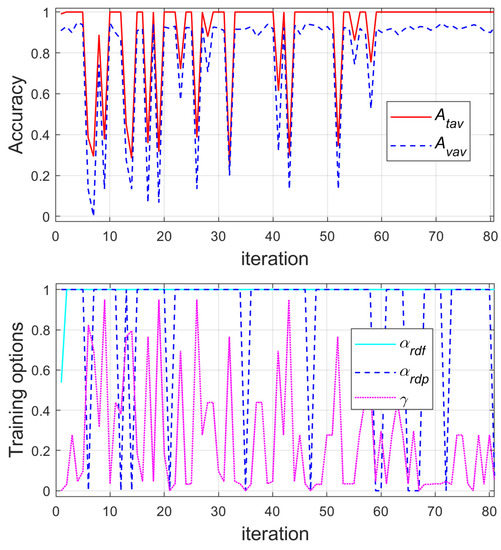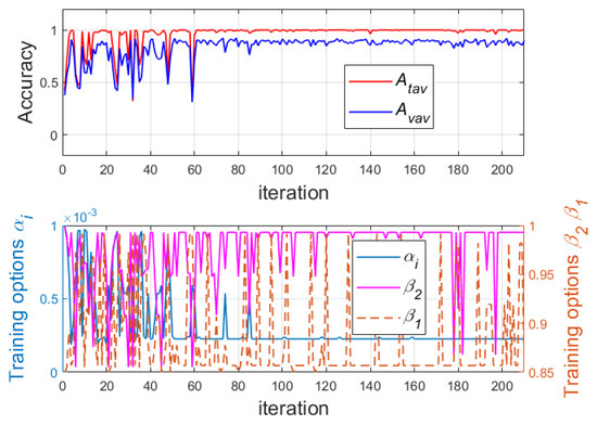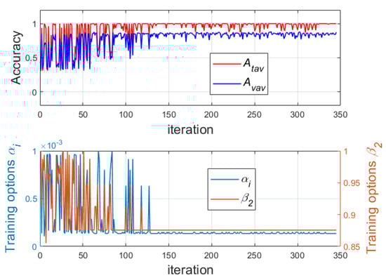 In the second phase of the second stage of the research, the training options of RMSProp were optimized by GA, especially and . The default value of was accepted. The constant is a denominator offset, which is needed to avoid division by zero in Equation (4). The training process of the RMSProp is illustrated in Figure 7. At the end of this process, the following values of the searched parameters were obtained: the initial learning rate , the squared gradient decay rate with an average training accuracy equal to 1 and average verification accuracy equal to 0.859.