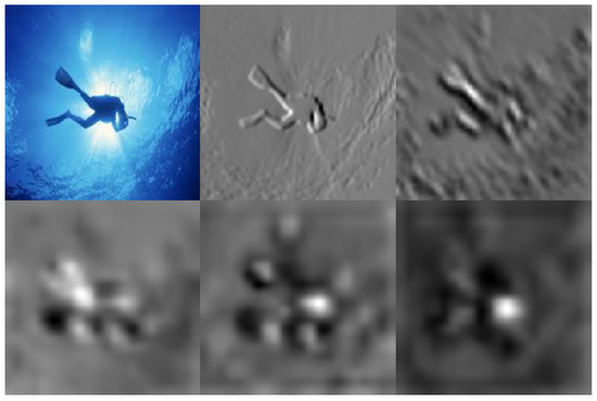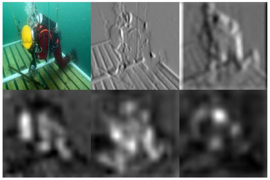 In Figure 9 and Figure 10 processed images obtained on the following convolutional layer outputs in addition to the source image are shown. Each output of the convolutional layer represents a different feature of the source image. In Figure 9 and Figure 10 only the outputs with the strongest activation were visualized to show which features the network learns to classify in underwater videos.