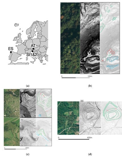 Archaeological features mapped according to morphological types (type 1 embeded features—blue, type 2 partially embeded features—green, type 3 standing features—red). Only the most relevant windows are shown for each test site at 100% crop size: (a) Location of test sites; (b) Test site AT); (c) Test sites SI1 and SI2; (d) Test site ES. DFM is visualized with sky view factor (16 search direction, search radius 10 pixels).