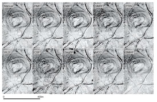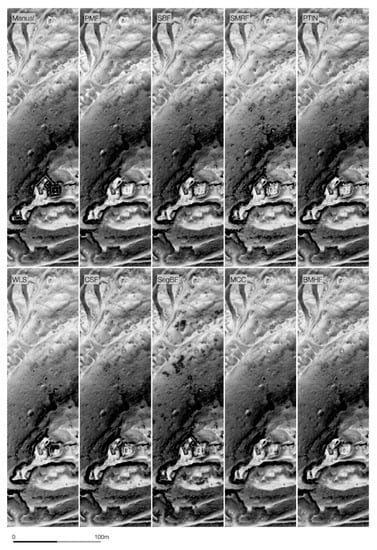 The 36 best results—9 filters each for AT (Figure 2), SI1 and SI2 (Figure 3), and ES (Figure 4)—were compared qualitatively and quantitatively. The comparison was made by adapting the qualitative and quantitative methods of Sithole and Vosselman [20] for archaeology.